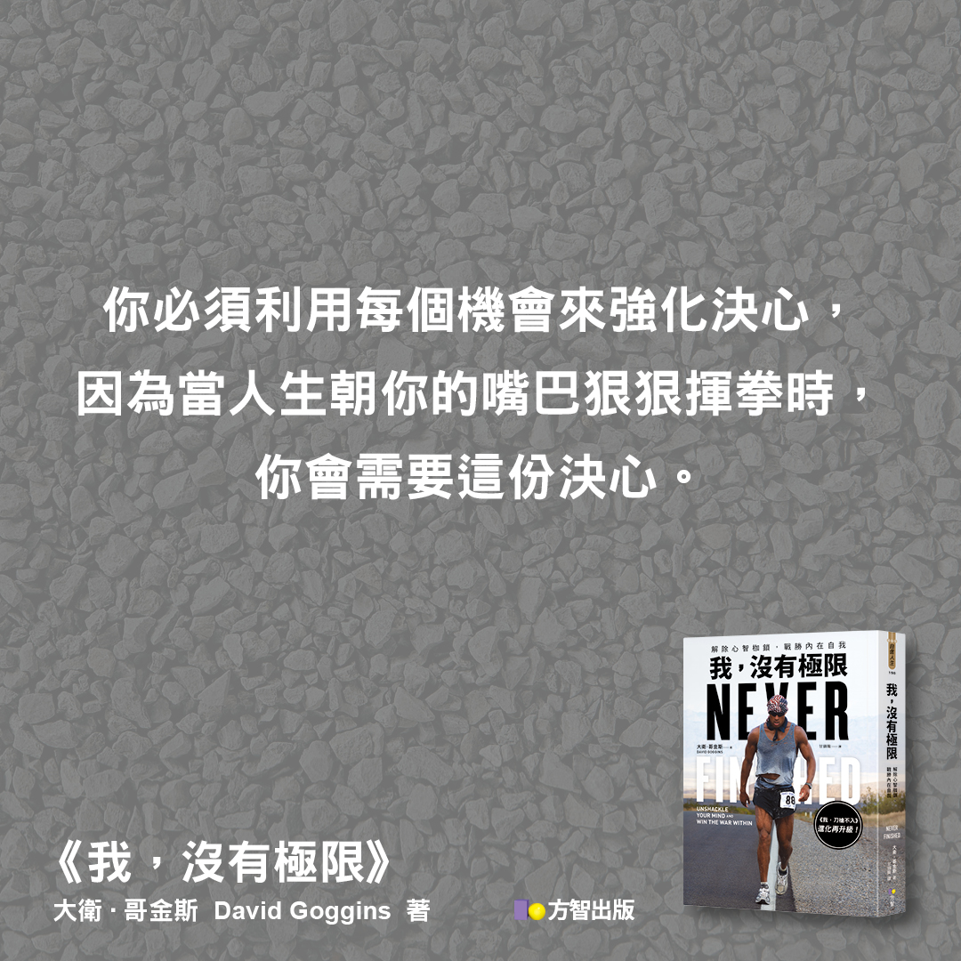如同指著月亮的禪師,哥金斯為我們指出了道路:專注於前進、拿負面能量作為燃料......,你會說「道理我都懂」,但唯有透過在生活中體現、實踐心理技巧的人才能脫穎而出。我相信,曾經承受巨大壓力的運動員及冒險家,以及在生活、事業中的冒險家,都會對書中相當同感,也會有所獲得。
