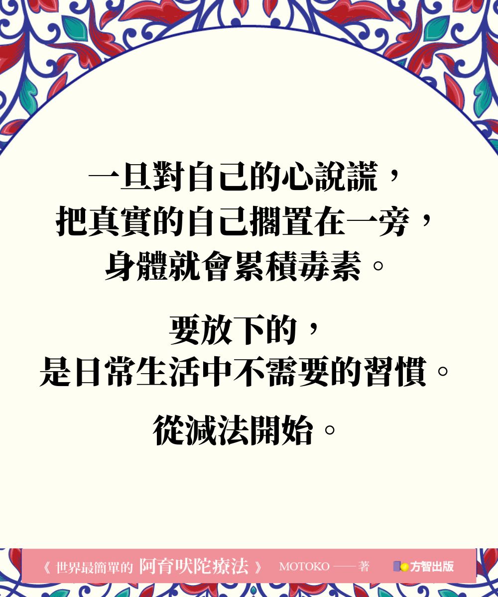 當你找到能讓自己感到舒適的生活方式,自然就會只吃身體需要的食物,去做真正必須採取的行動,成為不累積毒素的身體。 或許,順從自己的內心而活,才是真正的排毒。無論到了幾歲,心理、身體, 甚至人生,都還來得及改變。