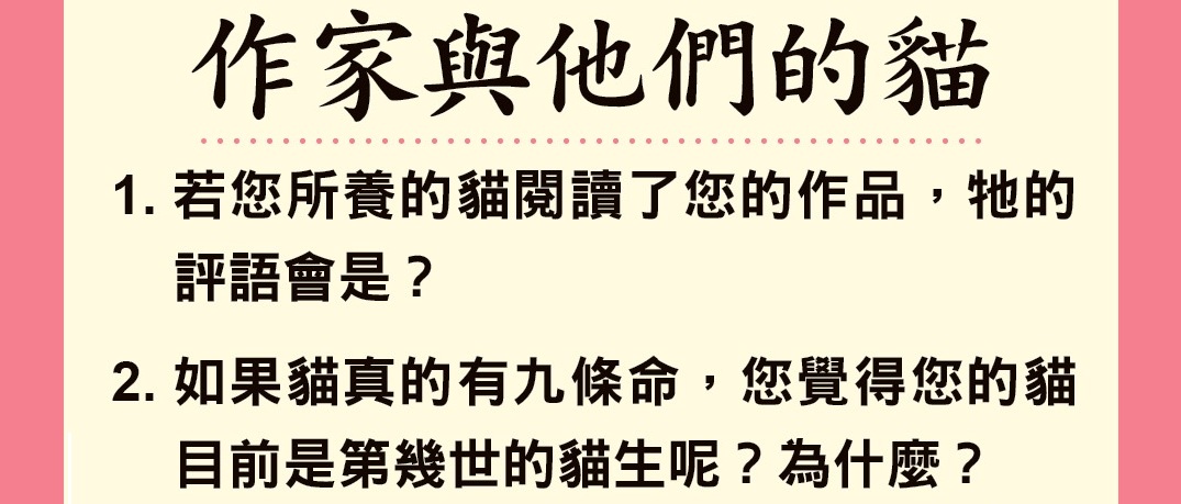 到底到底,貓與作家之間的「緣分」,要如何形容呢?圓神出版邀約到五位華文作家,替他們的貓設答兩個問題。