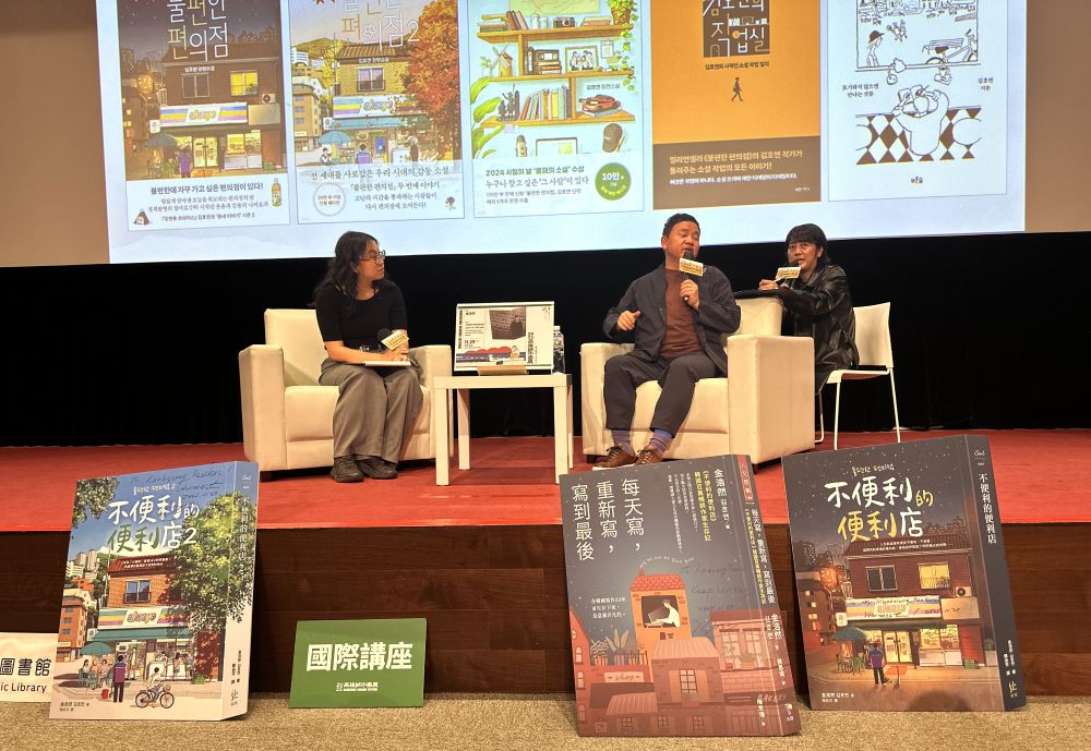 很快的,聽眾陸續坐定,金作家也在高雄市立圖書館副館長以及城市書展熱情工作人員陪伴下進場。入坐後,副館長還不時跟金作家聊起《不便利的便利店》書中的「嗆嗆嗆套組」,可見這些故事細節已經深入人心。