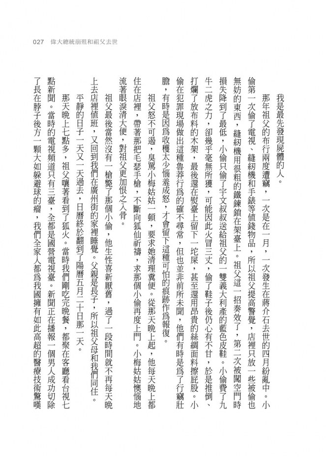 那一年,總統逝世,臺灣逐漸換上了愛迪達慢跑鞋的氣氛,女人在打麻將時抱怨物價飛漲,男人忍受著下班還要做家事的生活,年輕人則忙著談情說愛。祖父就是在那時候被人殺害。