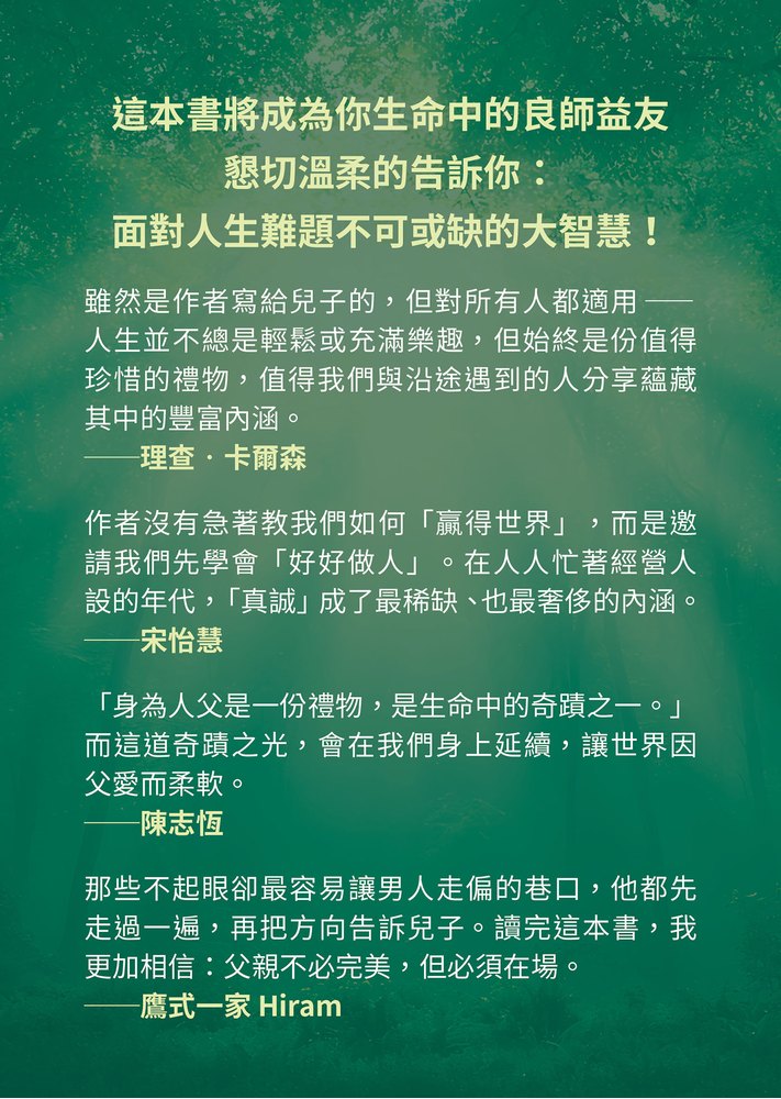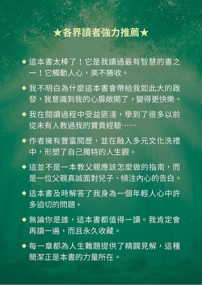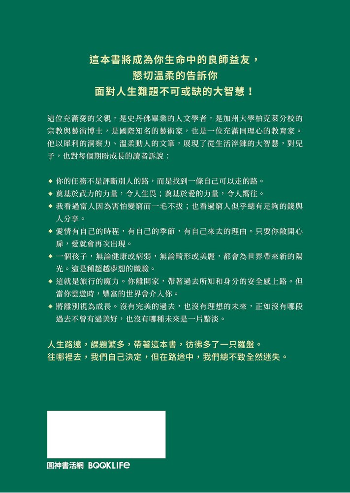 這位充滿愛的父親,是史丹佛畢業的人文學者,是加州大學柏克萊分校的宗教與藝術博士,是國際知名的藝術家,也是一位充滿同理心的教育家。他以犀利的洞察力、溫柔動人的文筆,展現了從生活淬鍊的大智慧,對兒子,也對每個期盼成長的讀者訴說: