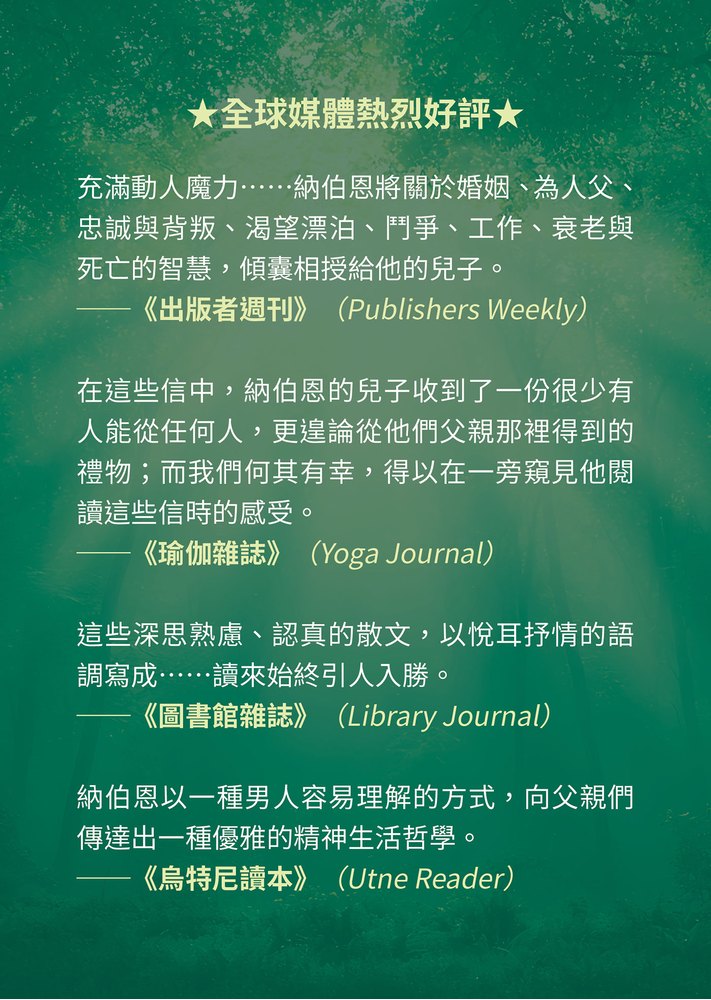 這是一位父親寫給兒子的信,亦是寫給每個在迷途中尋找方向的靈魂。在文字流轉間,他道出每個人都必須經歷的成長儀式:教育、良善、信任。真誠的筆觸像清晨的第一道光,不張揚卻大器地給予我們最穩定、最溫暖的力量。納伯恩說:「我必須發掘最真誠的自我去寫作。」當我們習慣圓熟世故的社交手段,往往弄丟了那個單純的、柔軟的、容易受傷的,卻會一再感動他人的「自己」。
