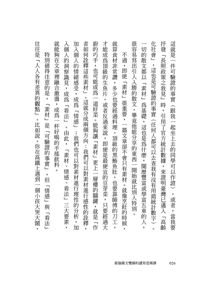 時至今日,雖然臺灣已是個幾乎沒有文盲的國家。然而,能夠快速、準確處理複雜文章的閱讀能力,仍然是少數人的高段技能。本書的目標不在培養「文藝青年」,而更希望讓大家先成為「好讀者」,讓閱讀可以成為或實用、或審美、或怡養個人性情的活動。「閱讀」這種高段技能,說起來並不困難,只是需要一點點簡明的引導。