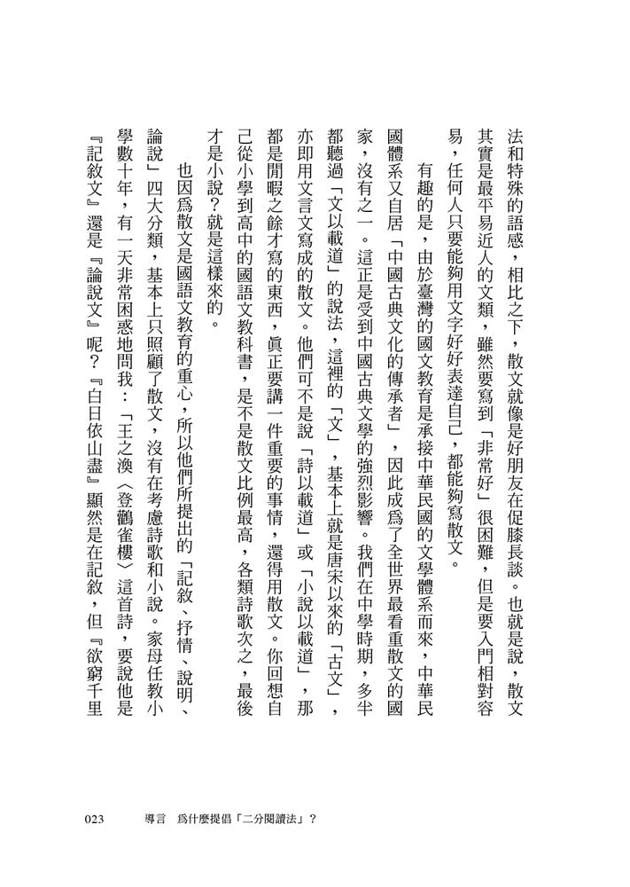 如果說上述方法,至少還讓我們看到一點進步的趨勢,有些詭異的框架,則是沒什麼道理,卻又在學校裡行之有年的。比如「四大文體」的分類:「記敘文」、「抒情文」、「說明文」和「論說文」。有些分類版本,則會把「論說文」與「議論文」混用,或者另外標舉「應用文」。不管是哪個版本的分類,就我一個文學寫作者和研究者來看,都是沒什麼道理、疊床架屋的分類。因為這些東西,其實在文學人心中,都是同一類。它們統統是「散文」,根本不需要分得那麼複雜。