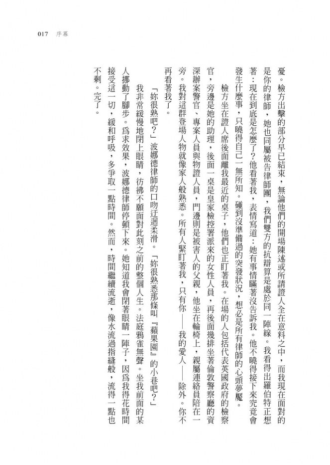 檢方坐在證人席後面離我最近的桌子,他們也正盯著我。在場的人包括代表英國政府的檢察官,旁邊是她的助理,後面一桌是皇家檢控署派來的女性人員,再後面幾排坐著倫敦警察廳的資深辦案警官、專案人員與物證人員,門邊則是被害人的父親,他坐在輪椅上,親屬連絡員陪在一旁。我對這群登場人物就像家人般熟悉。所有人緊盯著我,只有你——我的愛人——除外。你不再看著我了。