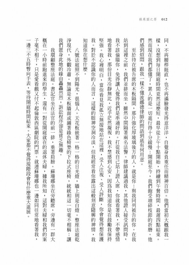 我喜歡這位法官。他會細心做筆記,也會客氣地舉起手請證人說慢一些。他常擤鼻涕,看起來有些虛弱。他對律師嚴厲,對陪審團卻很客氣,其中一名團員宣誓時結結巴巴,但他只是微笑點頭說:「女士,慢慢來沒關係。」我也喜歡這個陪審團,成員組合令人滿意,女性略微超過半數,包括三名非裔與六名亞裔,年紀從二十歲左右到六十來歲都有。很難想像這樣一群容易心軟的人會送我進大牢。現在看到他們坐得懶懶的,就更難想像了。此刻的他們比起剛開庭時截然不同,不再腰桿挺直,也不再滿臉發光得意洋洋,自覺身負重任而精神百倍。他們當初大概跟我一樣,沒想到每日開庭時間竟然這麼短,最早從上午十點開始,持續到午餐時間,最遲四點結束。然而現在我們都懂了,累人的是一切進行得十分緩慢:開庭至今,我們飽受瑣碎枝節的折磨。他們感到煩悶,跟我一樣不懂波娜德律師的問話到底有何用意。