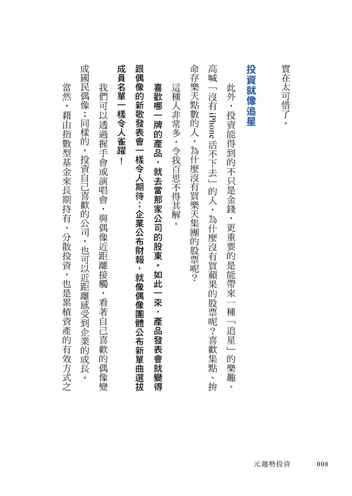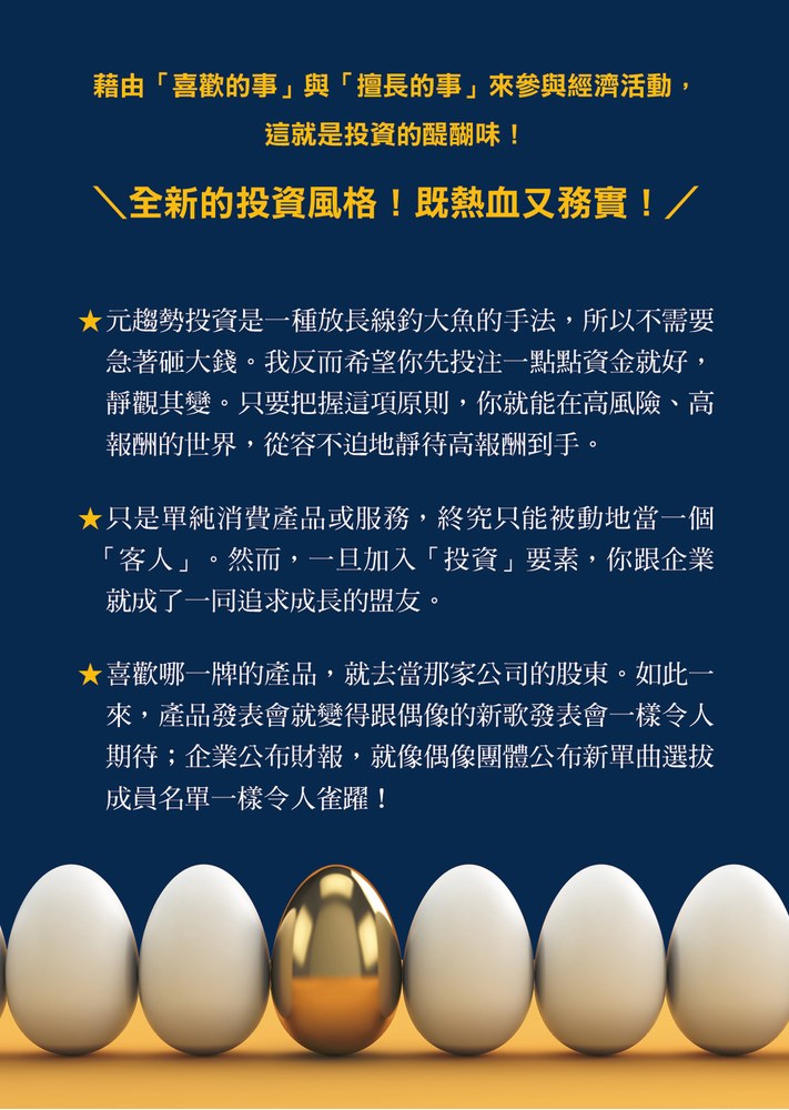 他在書中揭開元趨勢投資的資訊蒐集方法、選股視角,輔以實例和個人失敗教訓。他說,買股票就像追星,充滿了看著自己喜歡的偶像不斷成長成名的喜悅。在累積資產的過程中,同時享受社會的巨大變化,以及與企業一同成長的樂趣。