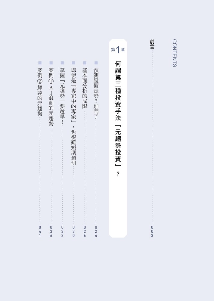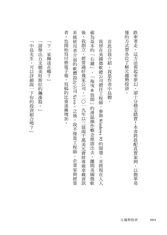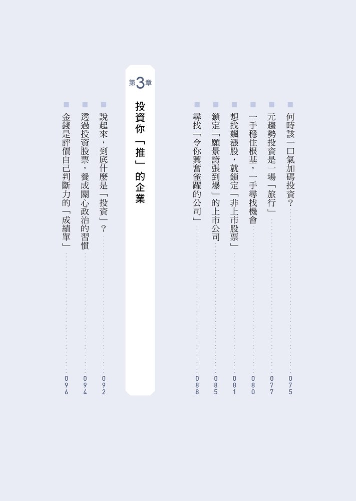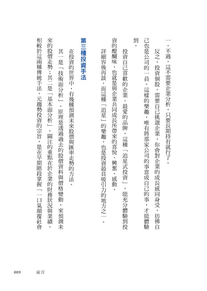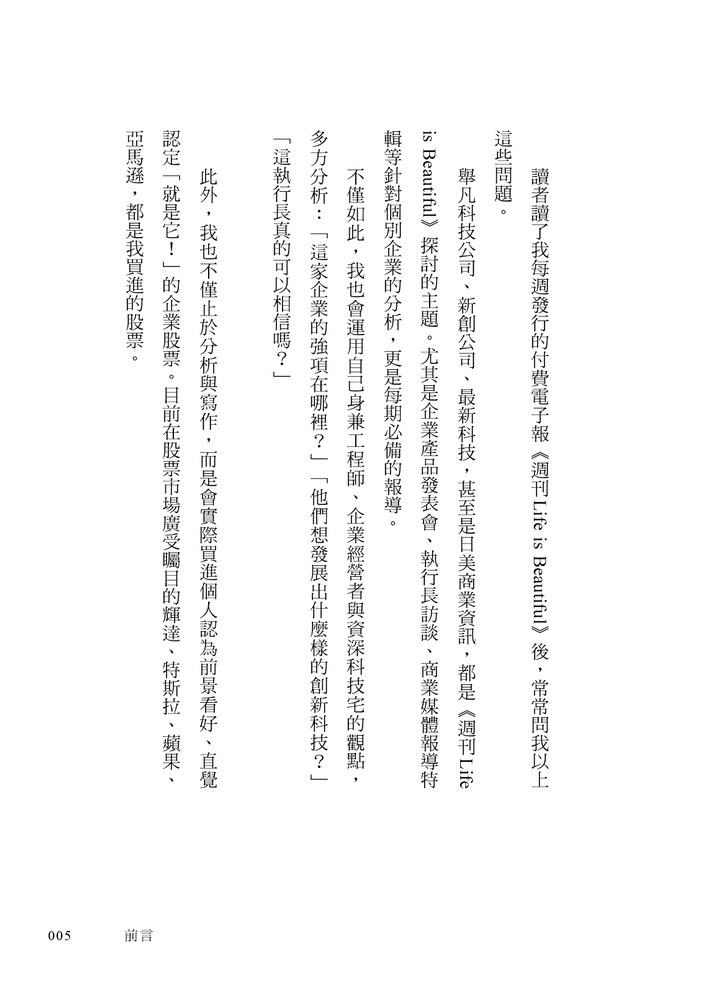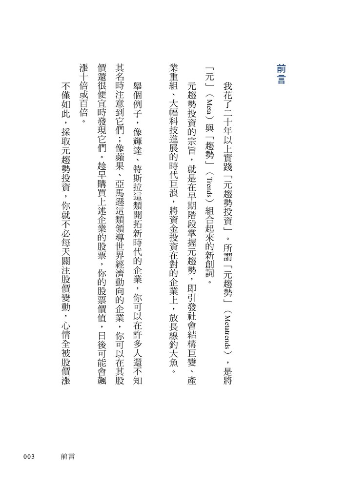 本書將介紹如何藉由蒐集資訊來掌握元趨勢、挑選企業,也會講述我個人經歷慘痛教訓而打造的投資鐵則。