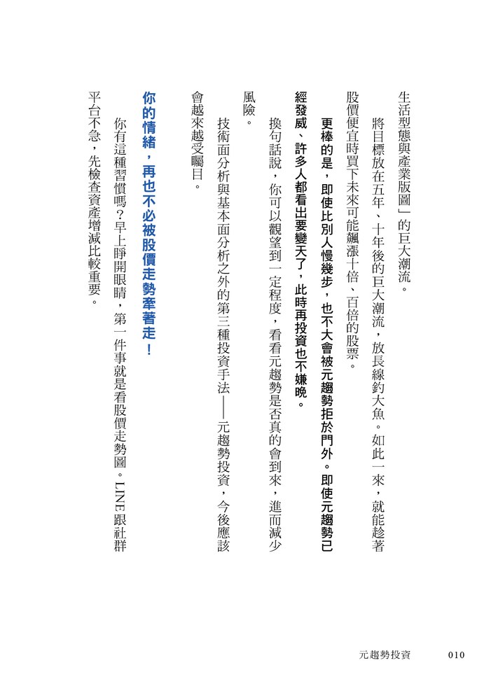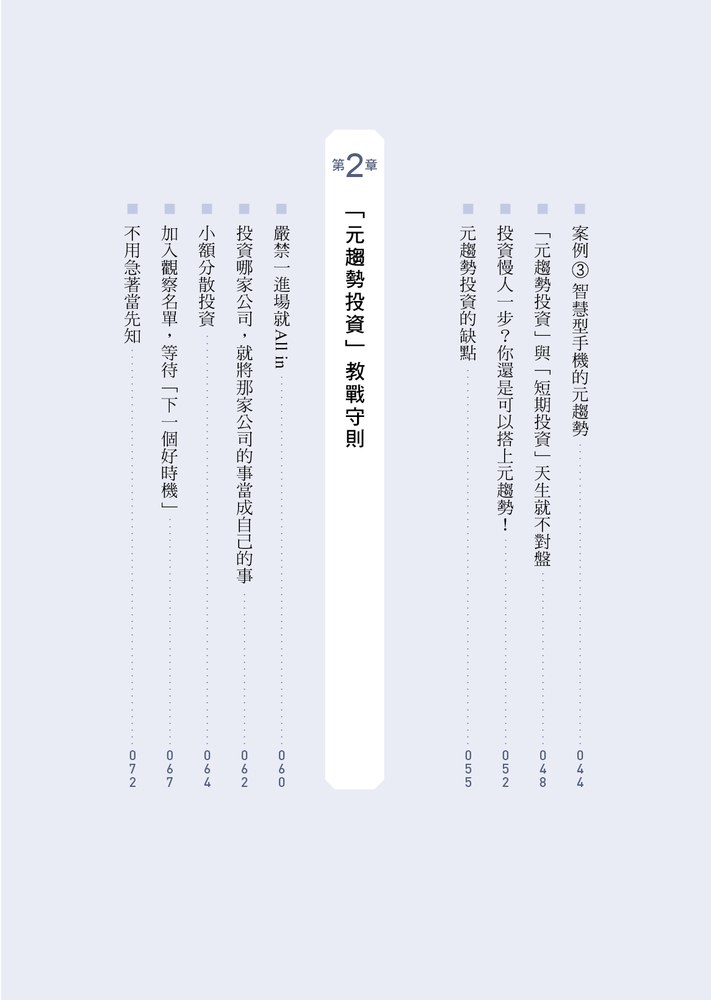 ★ 元趨勢投資是一種放長線釣大魚的手法,所以不需要急著砸大錢。我反而希望你先投注一點點資金就好,靜觀其變。只要把握這項原則,你就能在高風險、高報酬的世界,從容不迫地靜待高報酬到手。
