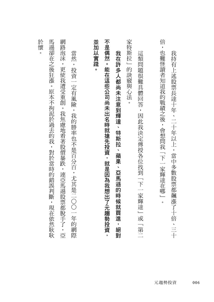 我在許多人都尚未注意到輝達、特斯拉、蘋果、亞馬遜的時候就買進,絕對不是偶然。能在這些公司尚未出名時就搶先投資,就是因為我想出了元趨勢投資,並加以實踐。
