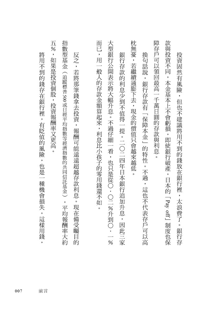投資固然有風險,但也不建議將用不到的錢放在銀行裡,太浪費了。銀行存款與投資不同,本金基本上不會虧損,即使銀行破產,日本的「Pay off」制度也保障存戶可以領回最高一千萬日圓的存款與利息。