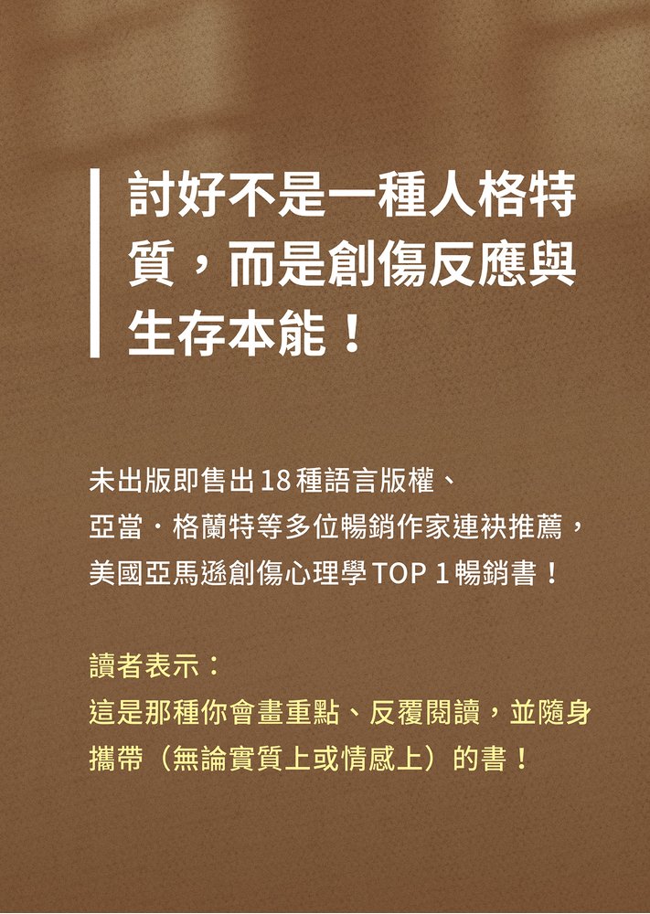 作者探討了鮮為人知卻「可說是最常見」的生存反應:討好,並巧妙融合了臨床專業知識、個人剖白與相關案例研究,成就了這部獨具匠心的睿智之作。──《新聞週刊》