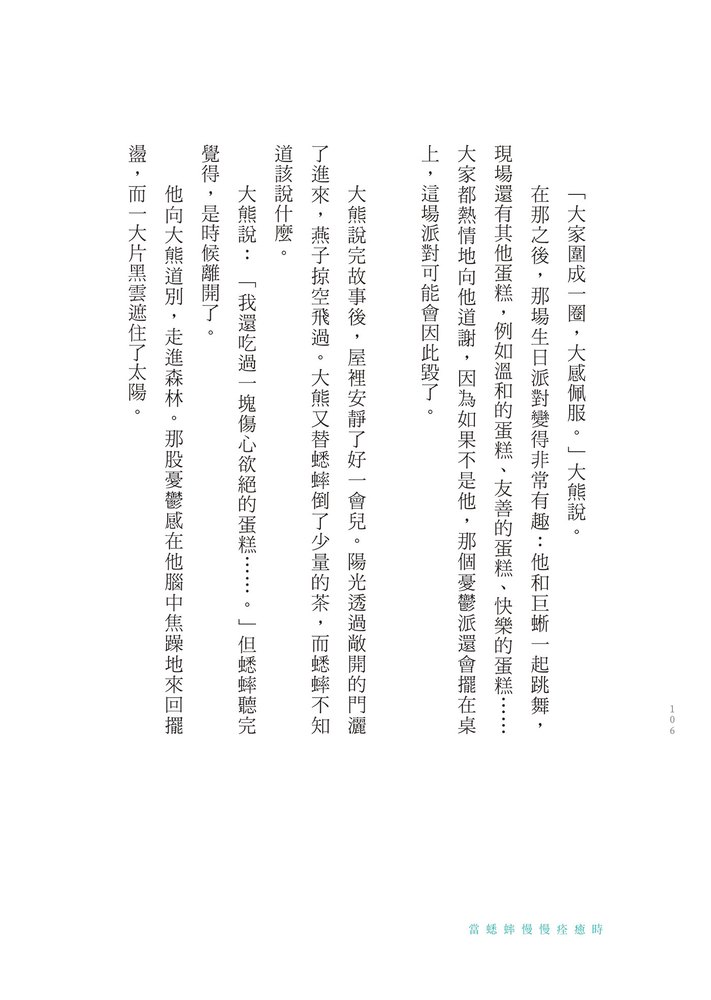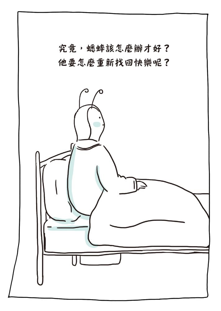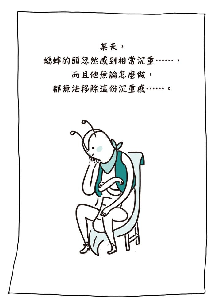 甫翻開《當蟋蟀慢慢痊癒時》的扉頁,我天真地以為這會是輕鬆溫馨的童話故事。然而,隨著情節鋪陳推展,字裡行間漸漸瀰漫著沉重與愁悶的氛圍。本是森林中最愛唱歌、最自在的小蟋蟀,卻在某一天,腦袋忽然壓進無法卸下的巨石,他嘹亮的歌聲變得遙不可及,快樂的笑顏成了昨日的記憶。長久盤旋在他心中卻難以啟齒的疑問:「當心突然變得好沉重、好沉重時,我該怎麼辦?」