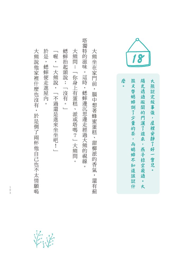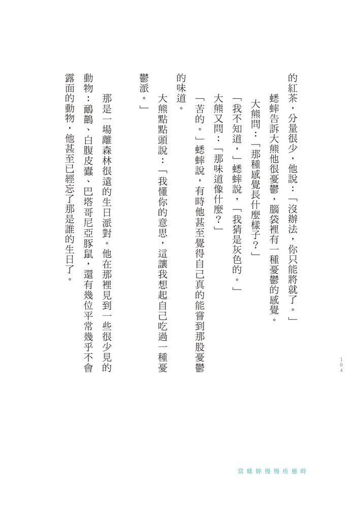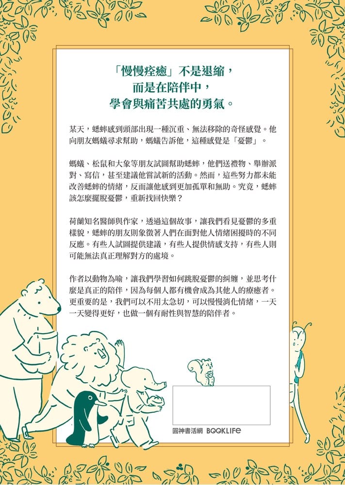 作者以動物為喻,讓我們學習如何跳脫憂鬱的糾纏,並思考什麼是真正的陪伴,因為每個人都有機會成為其他人的療癒者。更重要的是,我們可以不用太急切,可以慢慢消化情緒,一天一天變得更好,也做一個有耐性與智慧的陪伴者。