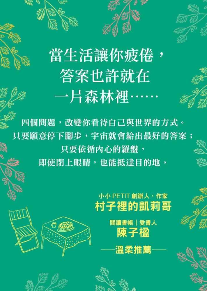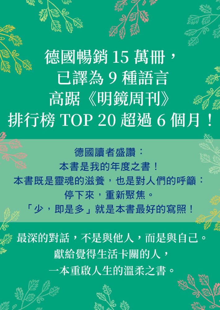※這是一本充滿愛意、貼近日常生活且引人深思的書。它不像許多指南書那樣大聲疾呼且具有挑戰性,反倒像個溫柔的擁抱和提醒,讓人思考當前的生活狀況,逐步審視並做出改變。