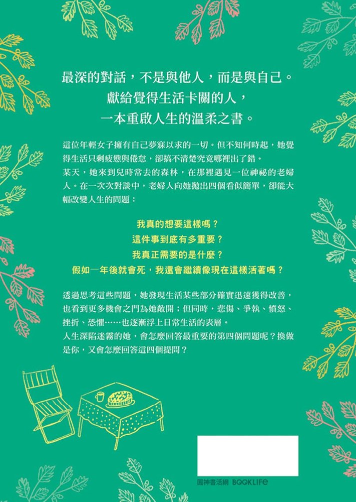 某天,她來到兒時常去的森林,在那裡遇見一位神祕的老婦人。在一次次對談中,老婦人向她拋出四個看似簡單,卻能大幅改變人生的問題: